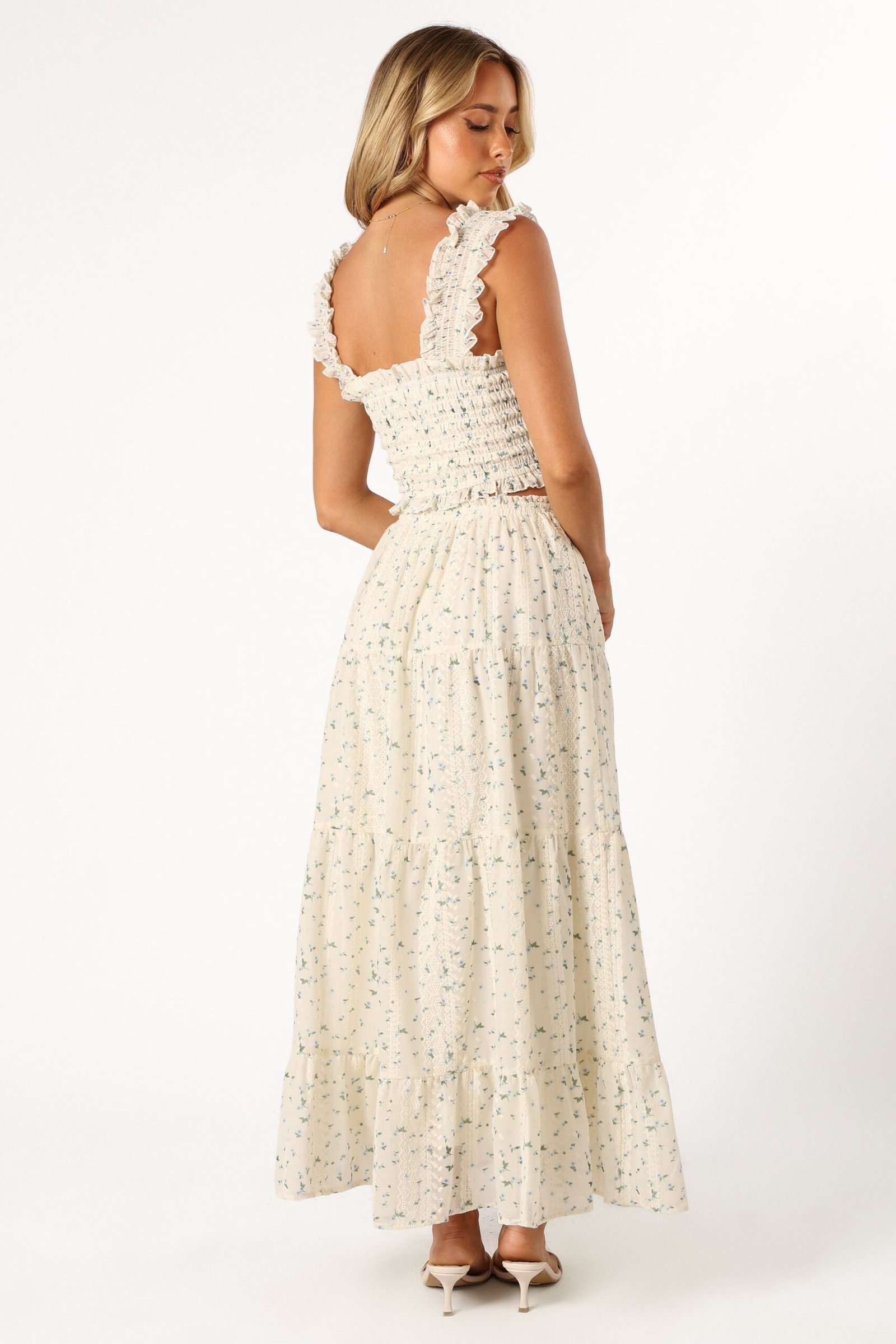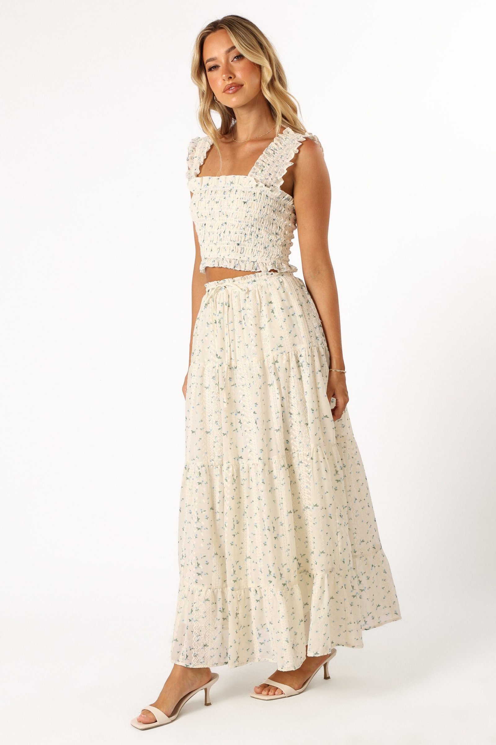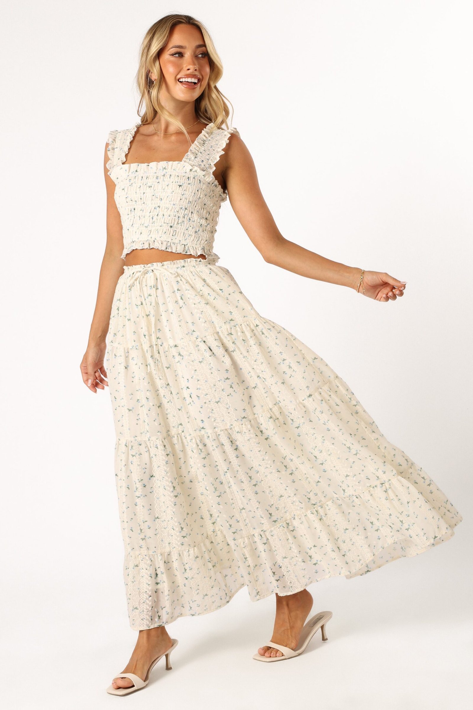 DETAILS This dreamy piece features an elasticised waist band and a waist drawstring tie close for a perfect fit. The drop tiered A-line design flutters with your every move, while the embroidered detail adds a touch of elegance. The vibrant floral print brings a playful, trendy vibe to the mix.