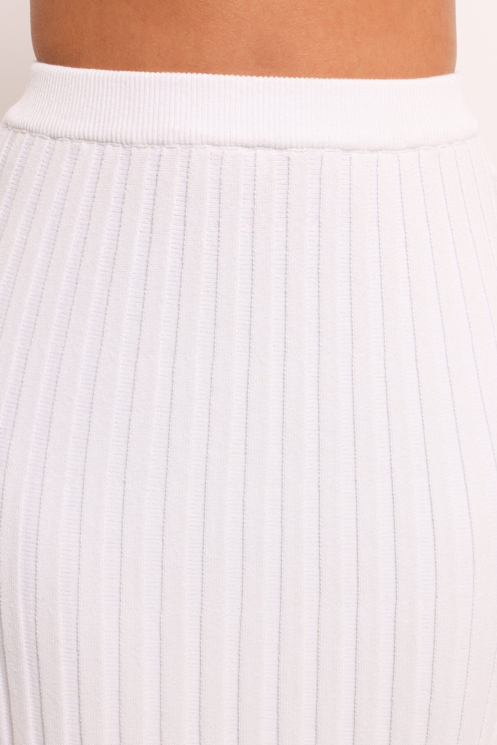 DETAILS Step into effortless elegance with the Kya Ribbed Knit Midi Skirt in White, a staple piece that effortlessly transitions from day to night. This high-waisted skirt features a soft knit ribbed texture that flatters every curve while providing comfort and style in equal measure.