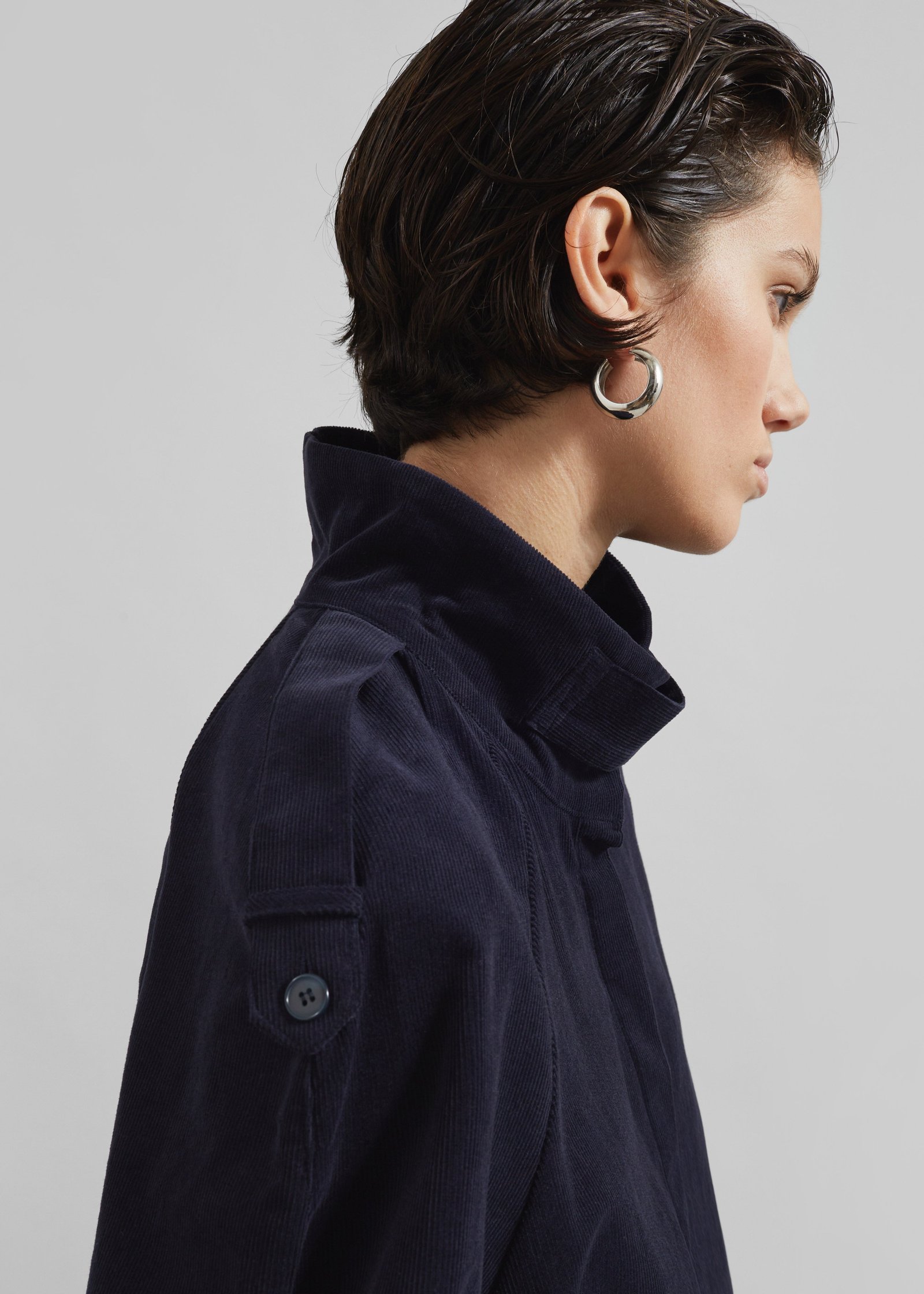 High collar with tab detail